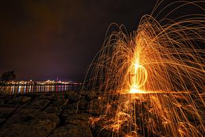 Selected work from my catalogue of Ring of Fire photographs - shot in 2017. This time-exposure technique involves using a cord to spin a burning piece of fine steel wool secured inside a whisk cooking utensil. As you can see, the sparks that result from the melting steel during the long exposure can create very interesting light-painting images. See the behind the scenes at www.alecfreda.com/projects/firerain © Alec Freda