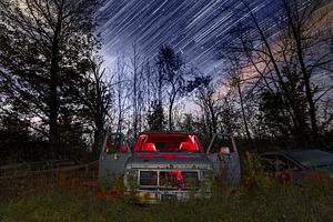 At McLeans Auto Wreckers in the cold wet weather, This van caught my eye. Here I have a red LED light in the van. The first frame I painted the foreground and an additional 80 frames of the stars.