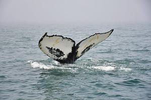 Whales often raise their tails, called flukes, out of the water when they dive. Here is a particularly beautiful one off the foggy coast of Nova Scotia, Canada. © Alec Freda